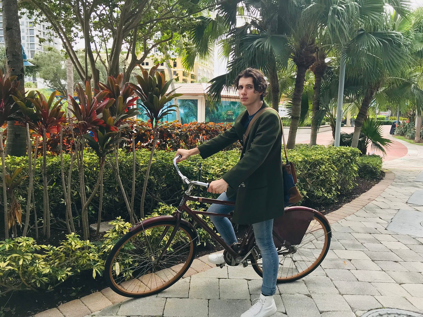 He jumps off the bench, grabs his worn blazer and messenger bag off of it and walks toward his antique bike nearby. He jumps on and rides into the city. He dodges traffic as he rides through the streets and onto the sidewalk.